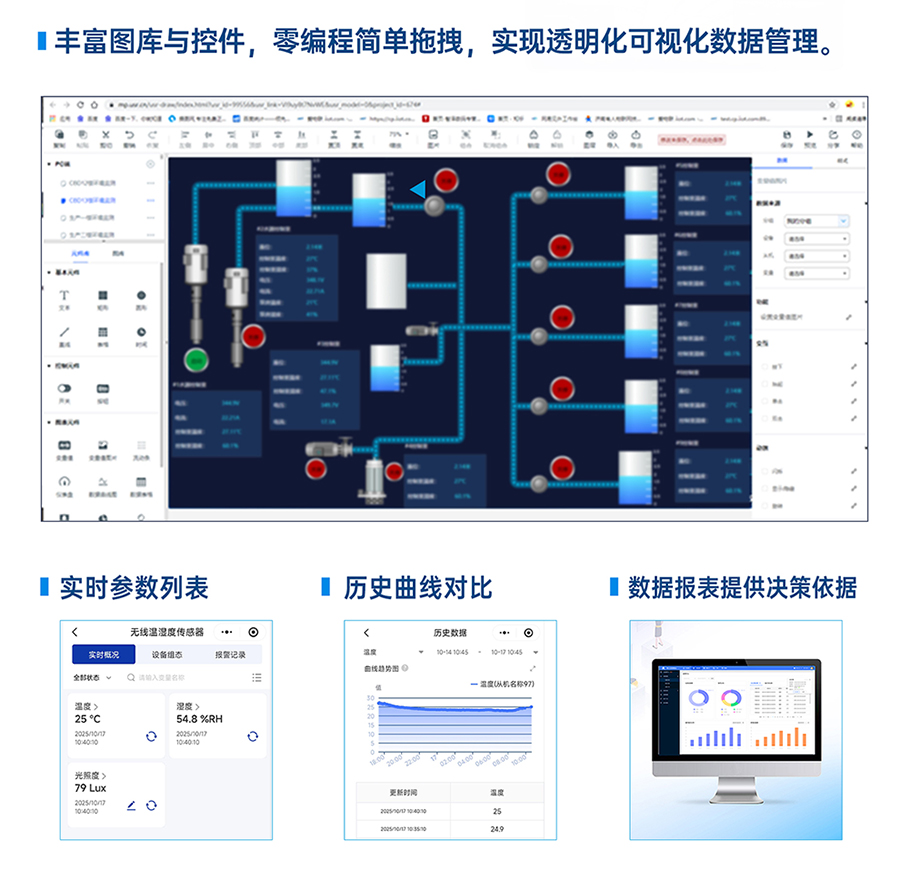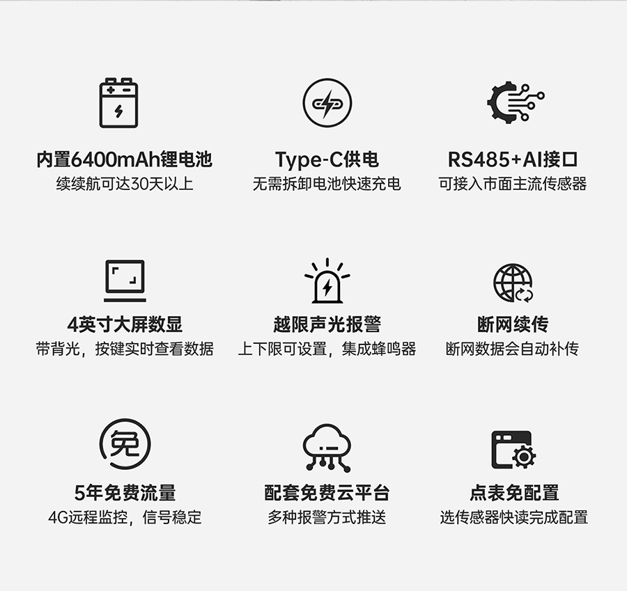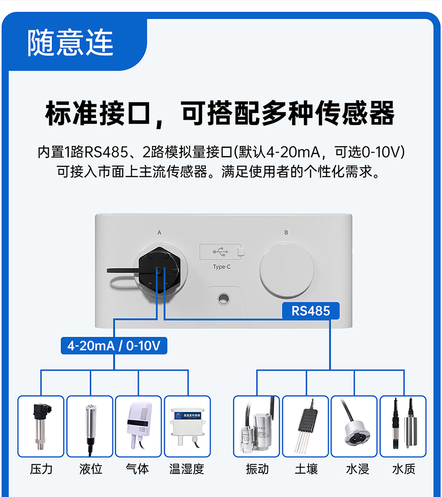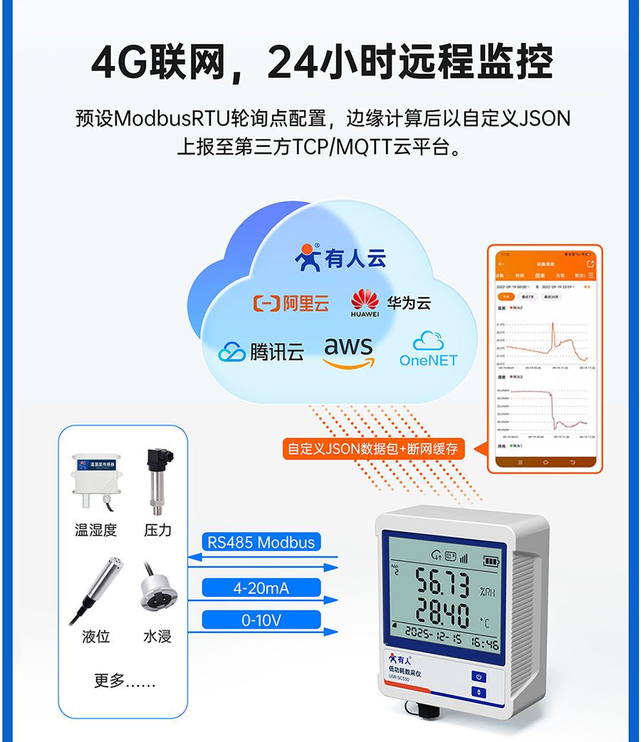 支持预置ModbusRTU轮询指令,边缘计算后自定义JSON模板主动上报