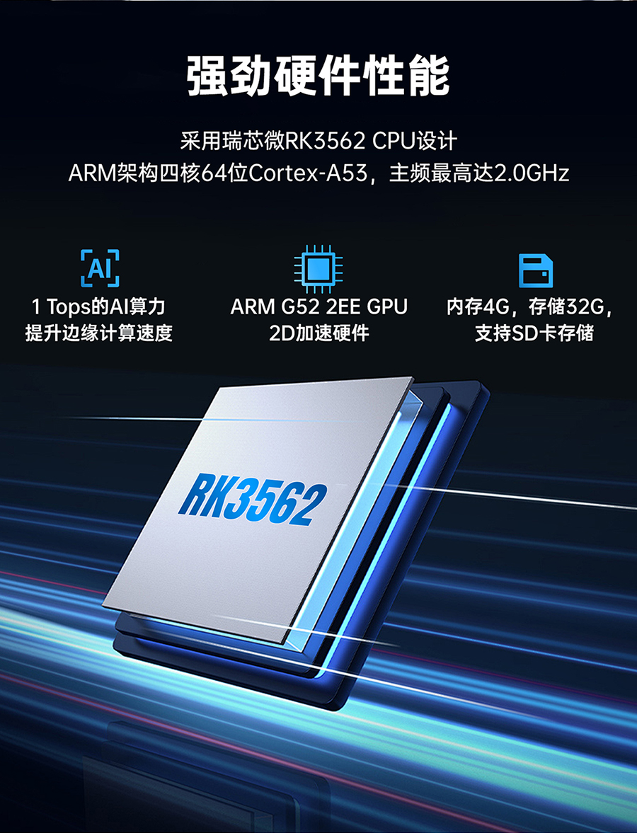 ARM四核64位CortexA53处理器,主频最高2.0GHz