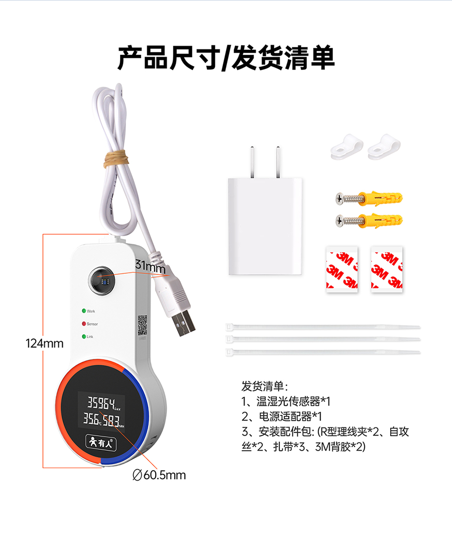 1.4英寸屏幕,支持温度、湿度、光照度本地显示,支持屏幕180℃翻转