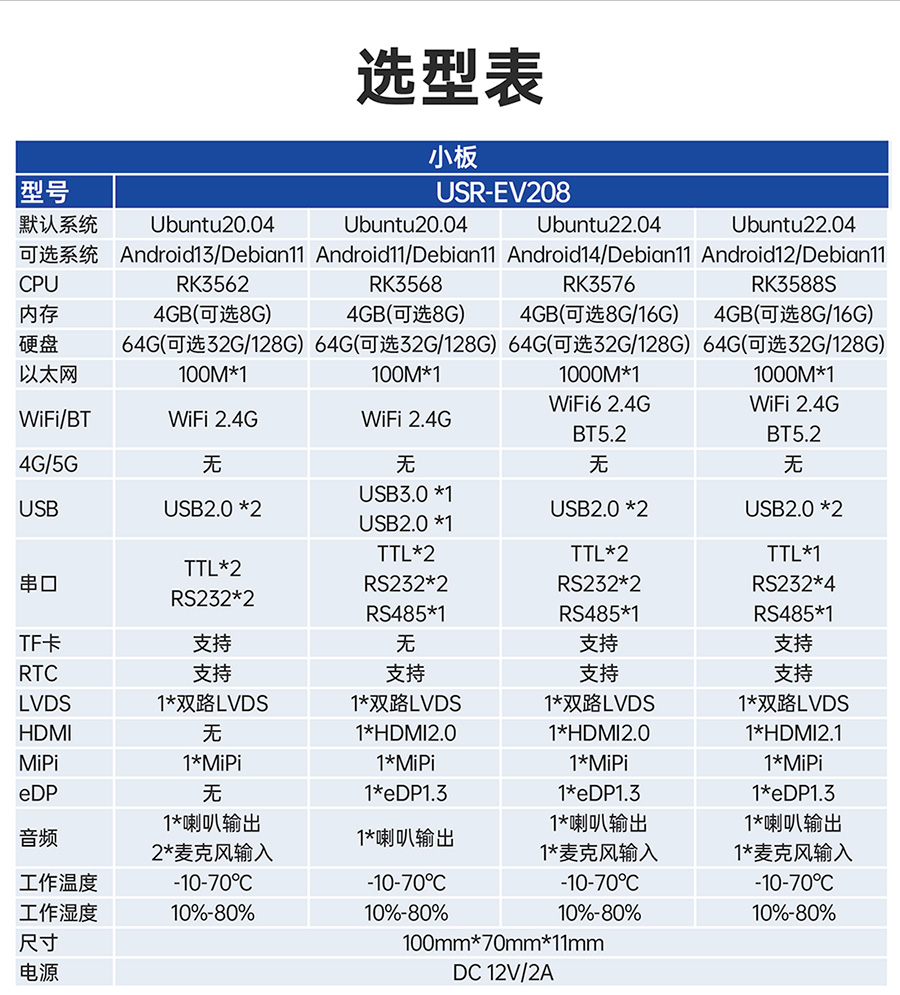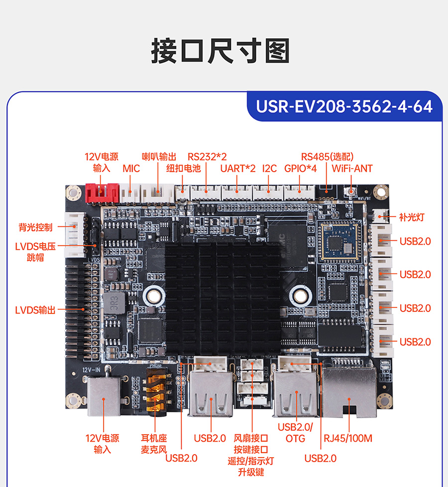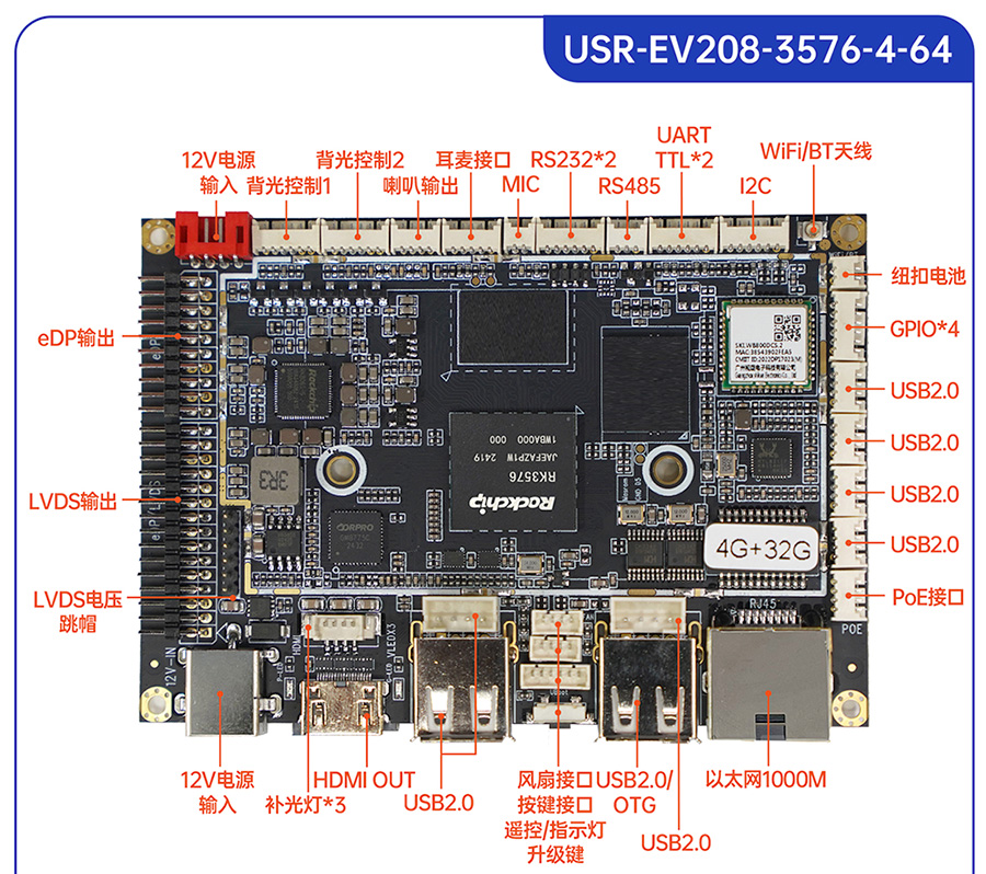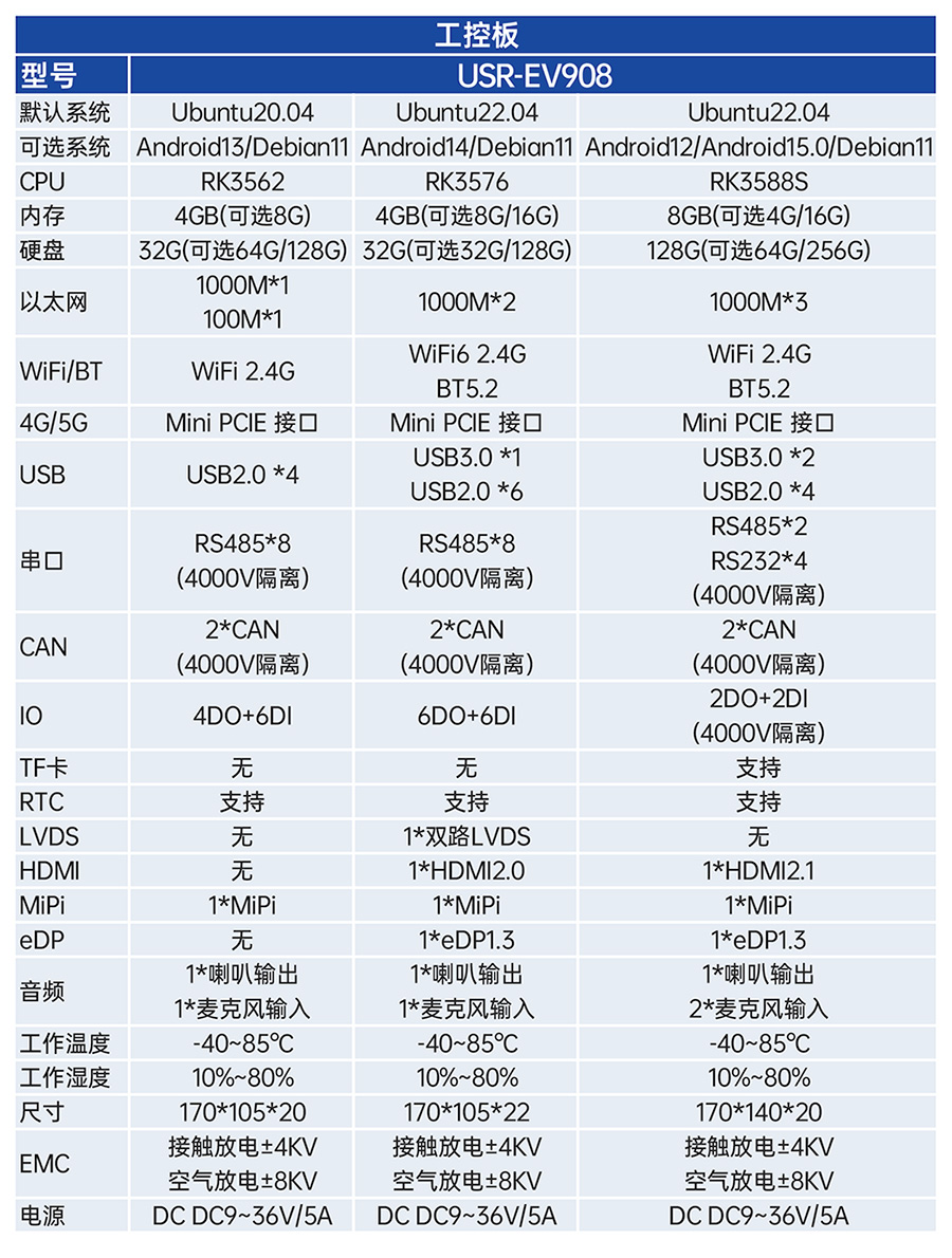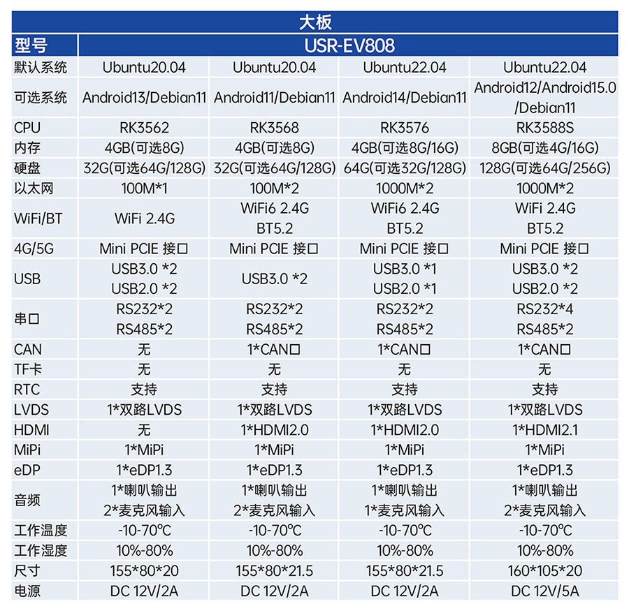 USR-EV系列工控主板基于瑞芯微RK平台打造,提供多款CPU配置可选,灵活适配。支持多种内存与存储组合,涵盖eMMC、LPDDR4等多种规格,兼顾性能与成本。EV系列提供多样化尺寸及丰富接口设计,包括标准网口、USB等通用外设接口,便于快速集成与部署。出厂预装系统可选Ubuntu、Android或Debian,满足各类行业需求,适用于工业控制、智能终端、边缘计算等领域。